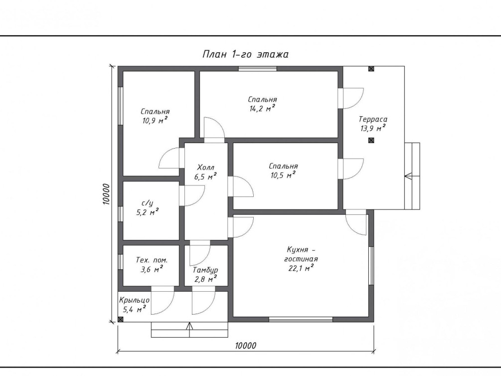 Площадь дома «Сенатор» — 106 м², планировкой предусмотрены техническое помещение с отдельным входом, санузел, холл, три спальни и кухня-гостиная. Расположение комнат оптимальное, кухня и санузел рядом с входом, что удобно, спальни — чуть дальше, благодаря чему жильцам гарантирован спокойный отдых. Из гостиной и двух спален есть выходы на террасу, которую в теплое время года можно превратить в уютную лаунж-зону.