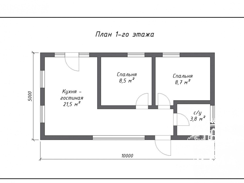 Планировка дома продумана таким образом, чтобы использовать все внутреннее пространство. В нем есть кухня-гостиная, две спальни и санузел. Благодаря тому, что гостиная и кухня были объединены, получилось помещение удобной конфигурации с окнами на три стороны. Комната будет наполнена естественным светом с утра до вечера, что сделает пребывание в ней комфортнее и приятнее.