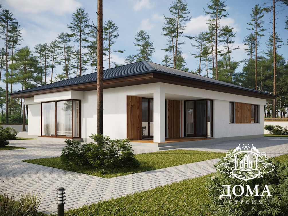 Для строительства одноэтажного дома по каркасной технологии требуется от 25 дней. Общая площадь дома «Вернисаж» — 171,7 м², на ней уместились сразу два санузла, просторная гостиная, три спальни и кухня с кладовой. В гараже, примыкающим к дому, есть техническое помещение, а выход из него в дом отделен дополнительным тамбуром, чтобы запахи не попадали внутрь. Все спальни в доме изолированные, чтобы комфортному отдыху ничего не мешало. Планировку дома при желании можно изменить.