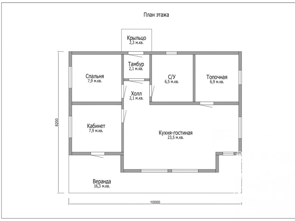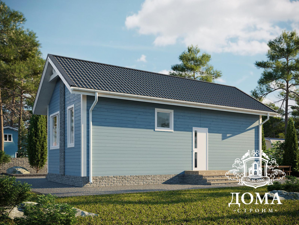 Планировкой дома предусмотрено все необходимое для жизни небольшой семьи: спальня, кабинет, санузел, котельная, большая кухня-гостиная с окнами на две стороны. Из кабинета есть выход на террасу, второй выход из дома — через тамбур на крыльцо, им удобнее пользоваться в холодное время года для снижения теплопотерь. Если у вас будут пожелания к изменению планировки, сообщите нам об этом, и мы адаптируем ее к вашим потребностям. Строительство дома по каркасной технологии займет от 25 дней, не считая финишных отделочных работ.