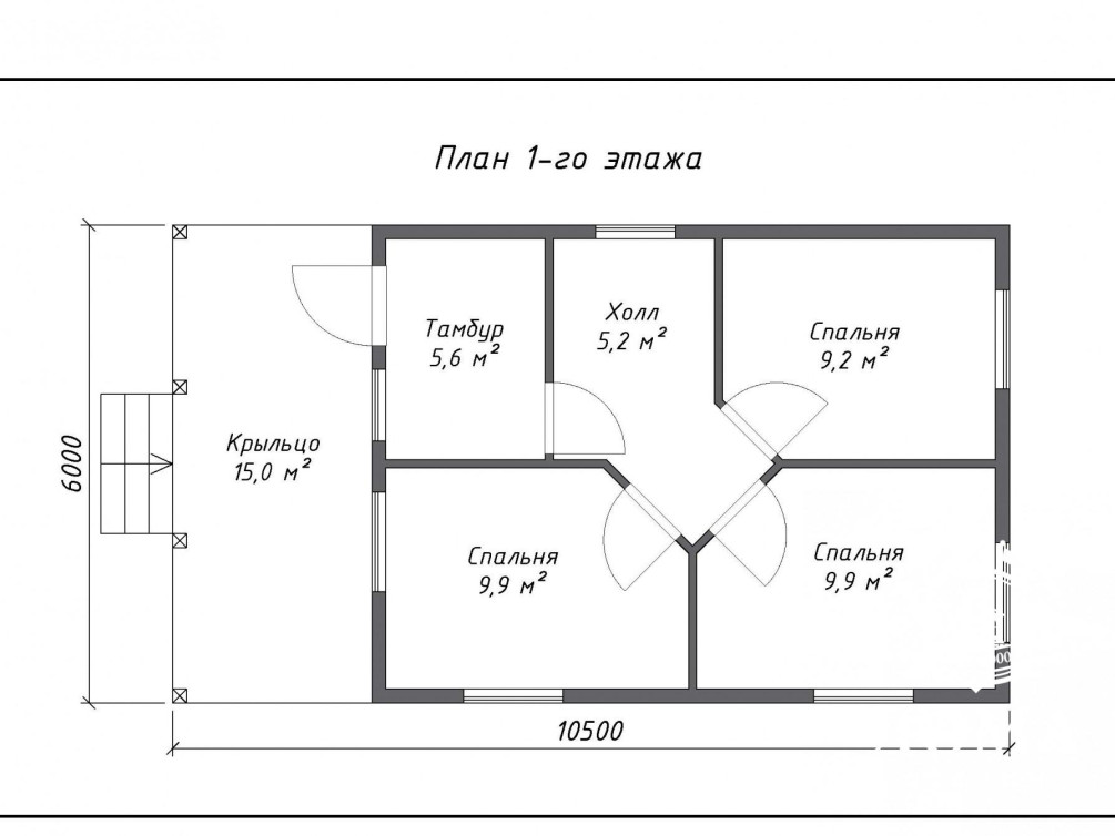 Перед главным фасадом дома расположена крытая терраса площадью 15 м2. Достаточно поставить на ней уличную мебель, и получится отличное место для завтраков или ужинов на свежем воздухе. Внутри дома — тамбур, три спальни и холл. Если у вас пожелания к изменению планировки, сообщите нам об этом, и мы найдем решение.
