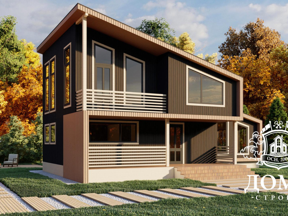 Каркасный дом по проекту «Восход» мы построим для вас за срок от 25 дней, тщательно соблюдая технологию и используя пиломатериал камерной сушки. Результат будет радовать вас долгие годы: дом будет теплым, красивым, не потребует вложений. Общая площадь дома с мансардой — 156 м². Плоская крыша, необычный архитектурный стиль и большие окна выделяют этот проект, как и крытая терраса перед главным фасадом. Прямо над ней расположен балкон, полы на нем, как и на террасе, сделаны из декинга ДПК. Стильный вид дому придает отделка фасадов планкеном.