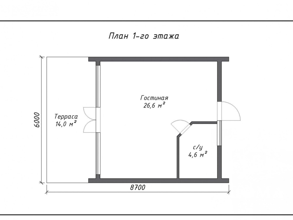 Планировкой предусмотрены всего два помещения: просторная гостиная и санузел. Главный фасад остеклен панорамными окнами, благодаря чему с утра до вечера дом наполнен естественным светом. На втором фасаде тоже есть окна, благодаря чему в доме уютно и комфортно. Перед домом расположена небольшая открытая терраса площадью 14 м2. В теплую погоду здесь можно поставить шезлонги или столик с креслом, чтобы наслаждаться свежим воздухом.