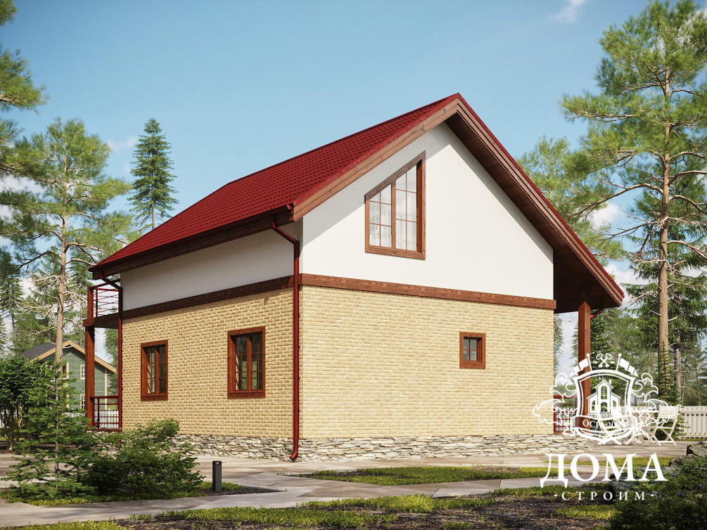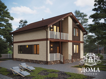 Особенностью дома стала большая крытая терраса, ее площадь составляет 20,6 м2, а также балкон над ней той же площади. Летом они станут чудесным местом отдыха для всей семьи, приема гостей. Планировка первого этажа делит внутреннее пространство на кухню-гостиную, спальню, санузел и кладовую. В мансарде — еще три спальни и большой санузел, места в нем хватит и для установки ванны и другой сантехники, и для стиральной, сушильной машины. Из двух спален наверху предусмотрен выход на общий балкон.